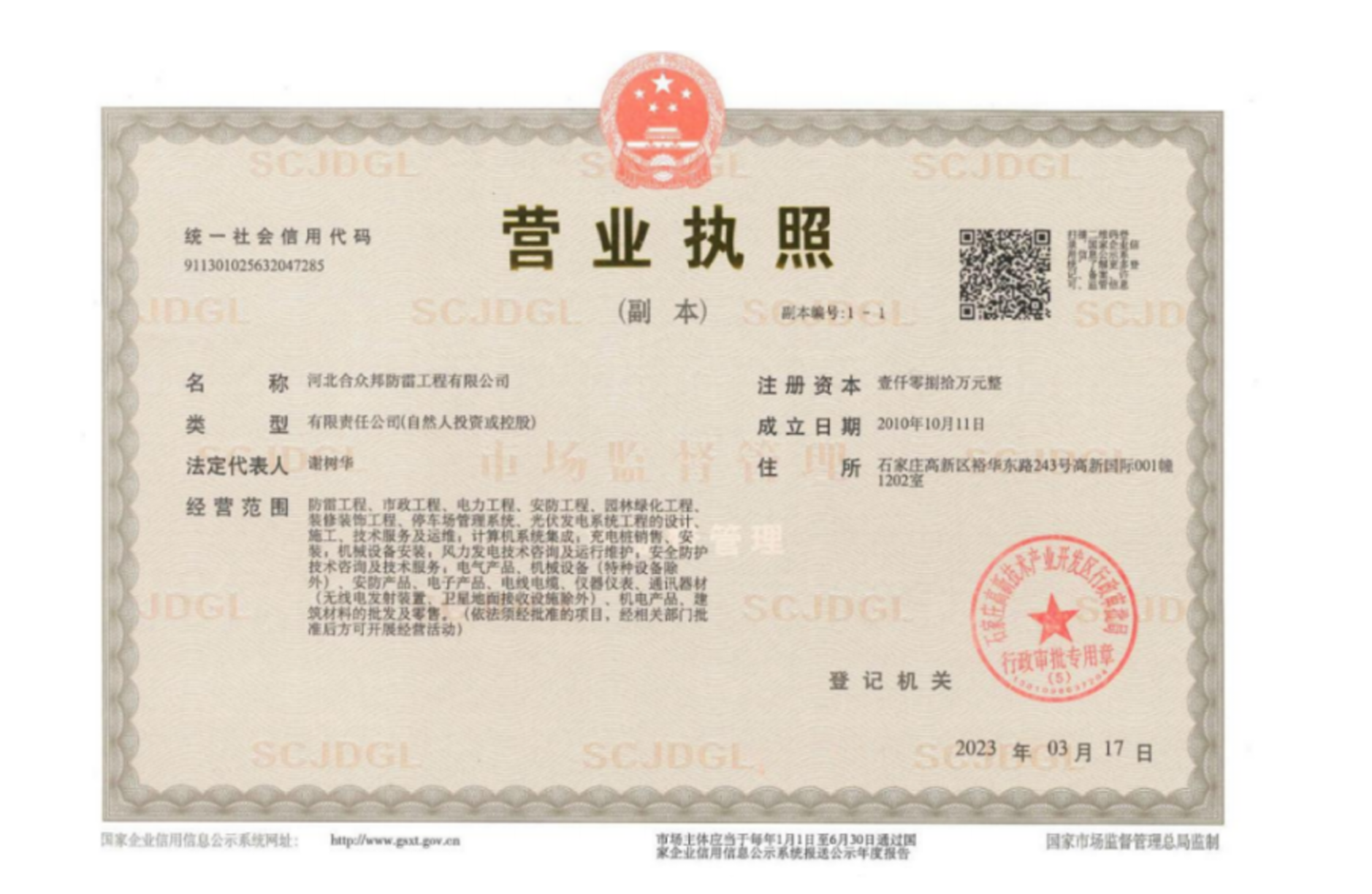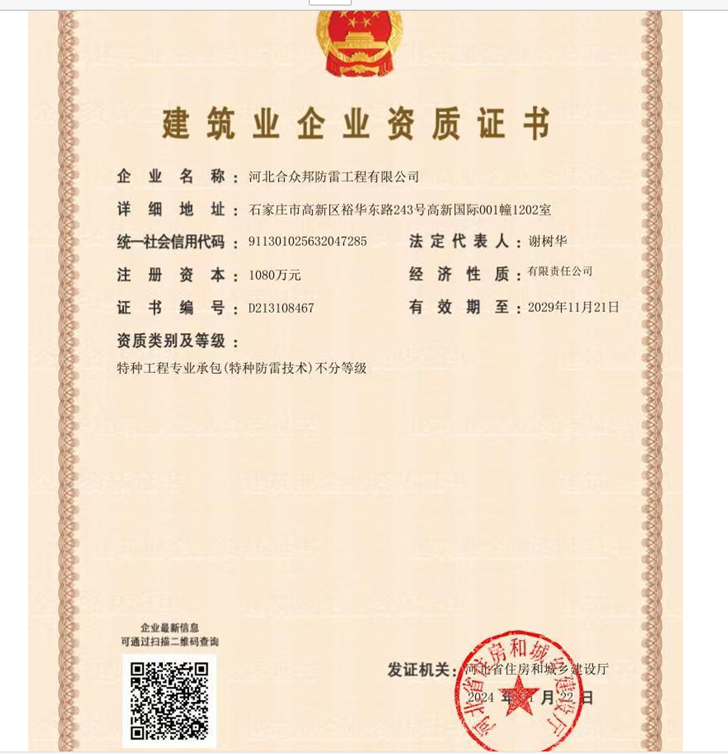 河北合众邦防雷工程有限公司成立于2010年10月11日,注册资金1080万元整,具有特种防雷施工资质和安全生产许可证的权威机构。经营范围:大型防雷工程设计施工、古建筑防雷接地、油库避雷针、网、线、杆的安装、避雷塔施工、防雷检测、防雷验收咨询等服务。目前,公司已获得气象局颁发的 《防雷工程专业设计资质证》和《防雷工程专业施工资质证》的双乙级资质单位并通过了ISO9000质量体系认证。